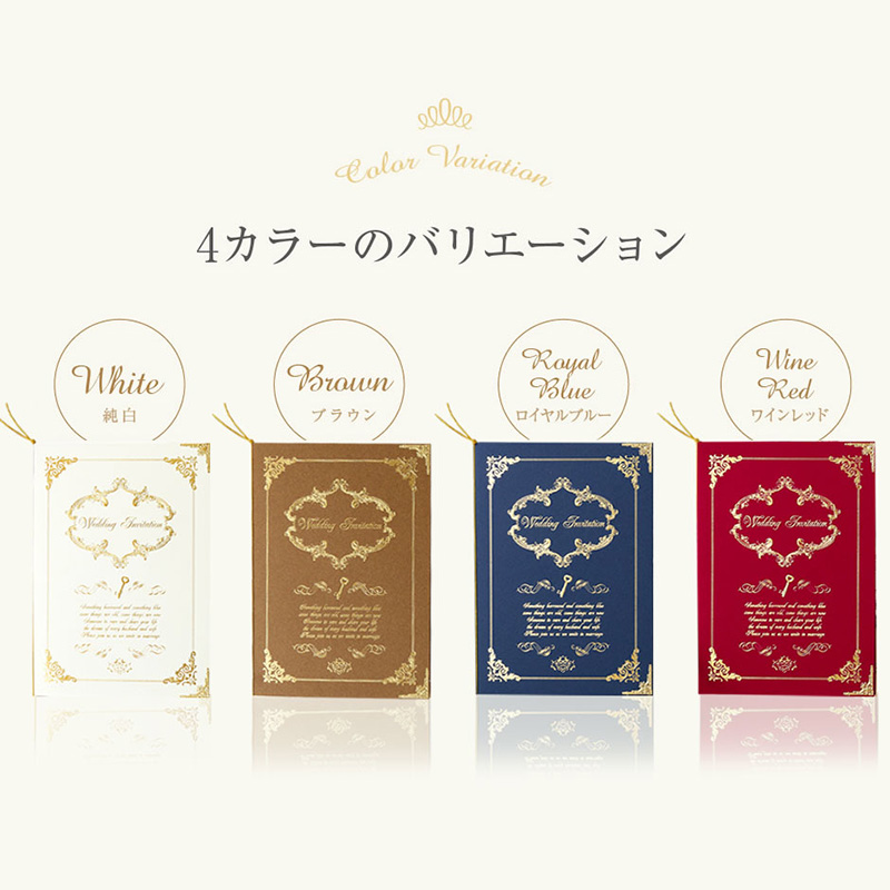 高貴なロイヤルブルーにゴールドの文字が高級感ある招待状「ル・クール」は、フランス語で心を意味することば。大切なセレモニーにお招きするゲストに、ふたりの心を伝えるのにふさわしいね。「ルクールロイヤルブルー」結婚式招待状は、高貴で上品なロイヤルブルー(ネイビー)の表紙に、ゴールドの文字が箔押しされた格調高いデザイン。緻密であたたかな質感の表紙を縁どる優雅な模様や角金具が高級感を高めて、アンティークな洋書を思わせるね。