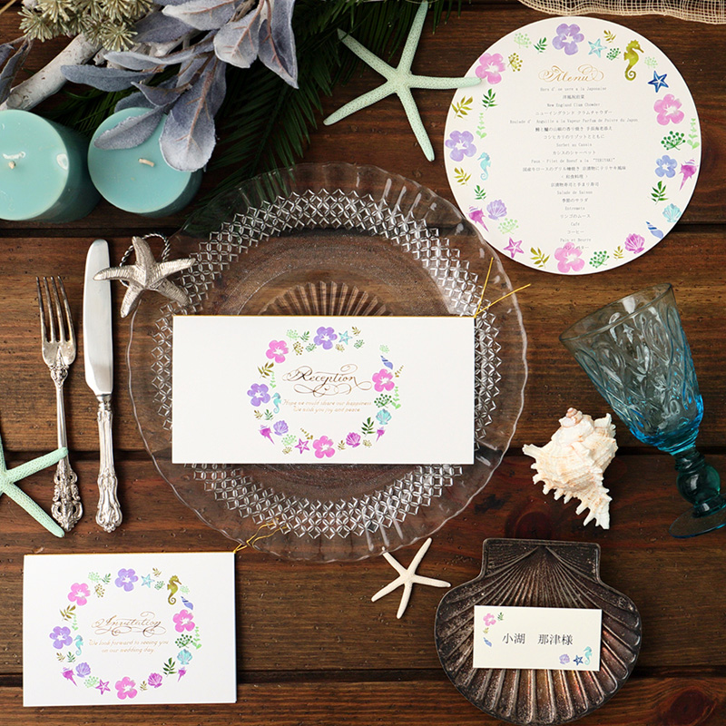 海の仲間たちがキュートなリースを作ったメニュー表優しい色合いの貝殻やタツノオトシゴなどをリースのように丸くデザインした結婚式メニュー表「プラージュ」。海の仲間たちにかわいいお花も散りばめたキュートなデザインが、ふたりのパーティーを楽しく彩るよ。